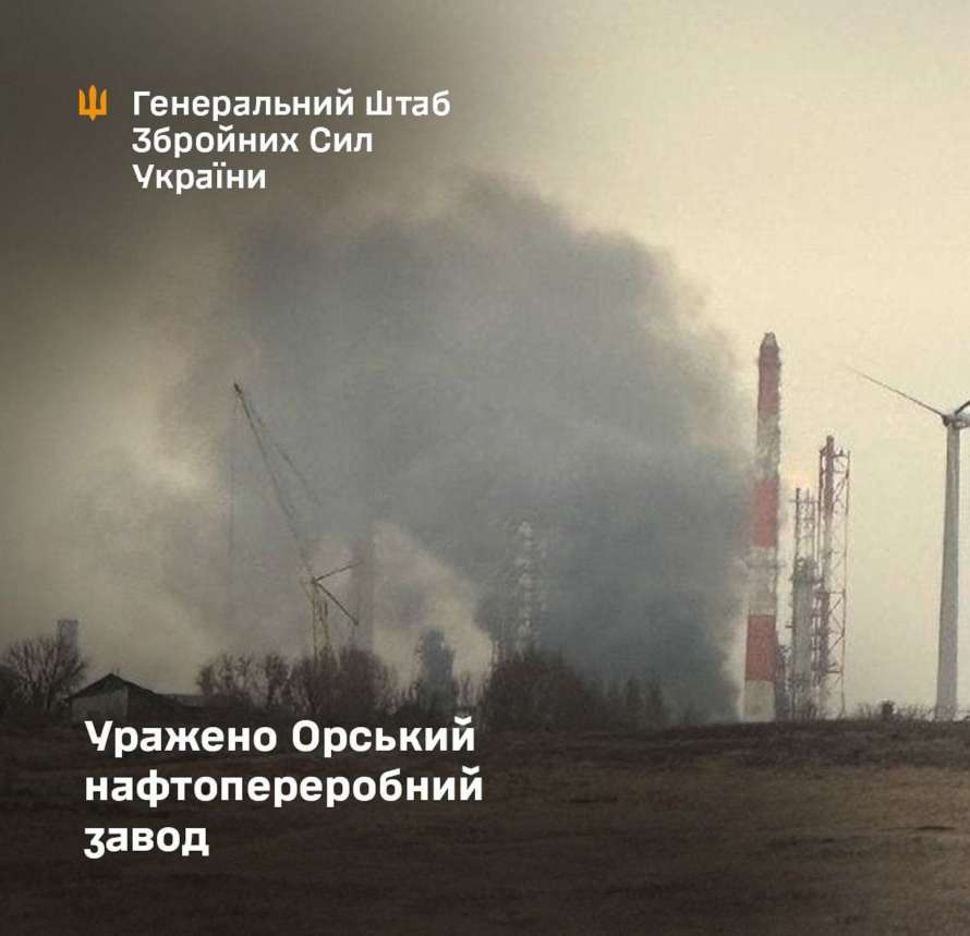"В рамках зниження наступального потенціалу противника та ускладнення постачання пального і боєприпасів до військових частин окупантів, 11 листопада підрозділи Сил оборони України уразили потужності нафтопереробного заводу "Орскнєфтєоргсінтез" в Оренбурзькій області рф. Завод випускає понад 30 видів нафтопродуктів – бензини, дизельне пальне, авіаційний гас, масла тощо. Проєктна потужність переробки – 6,6 млн. тонн нафти на рік. Задіяний у забезпеченні російської окупаційної армії", - повідомляє Генштаб ЗСУ.