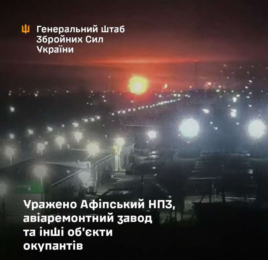 Сили оборони вчергове завдали ураження по нафтопереробному заводу "Афіпський" у Краснодарському краї РФ, який задіяний у забезпеченні російської окупаційної армії. Зафіксовано вибухи в районі цілі з подальшою пожежею на об'єкті.