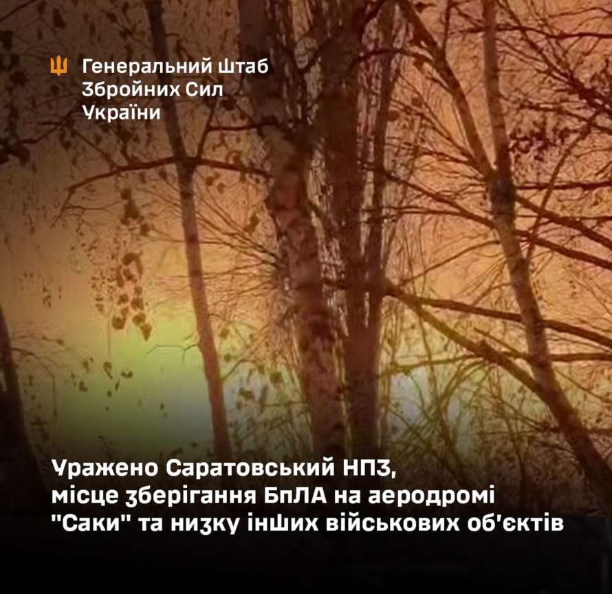 У ніч на 28 листопада підрозділи Сил оборони України уразили Саратовський нафтопереробний завод, місце зберігання БпЛА на аеродромі "Саки" та низку інших військових об'єктів РФ.
