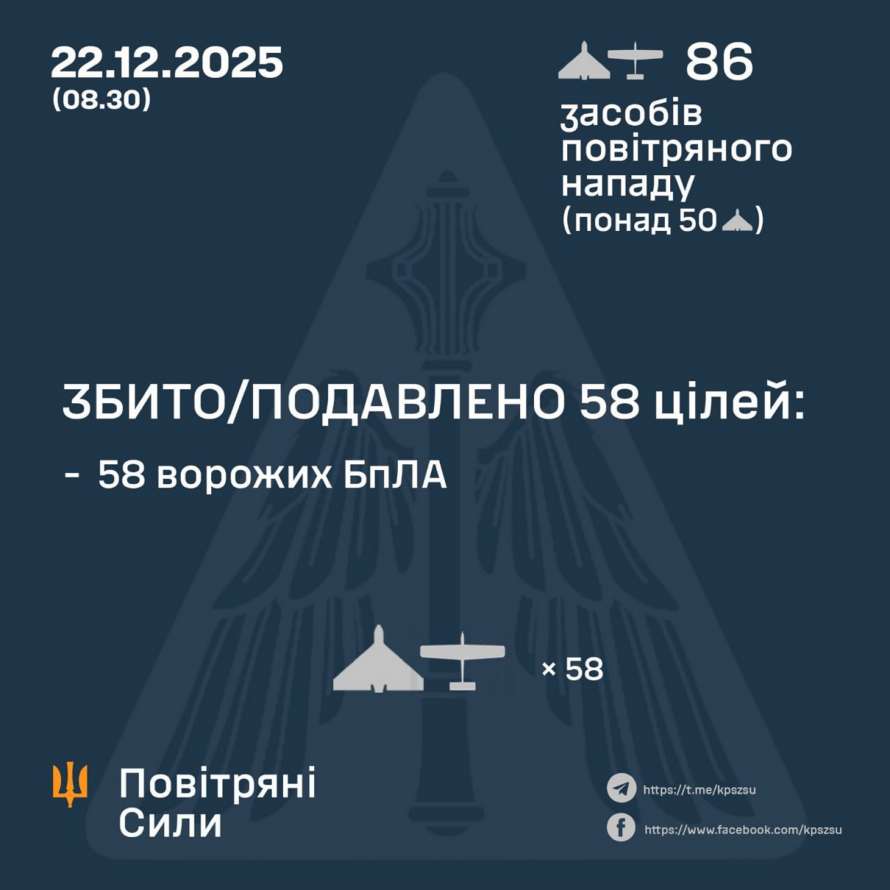 У ніч на 22 грудня (з 19:00 21 грудня) противник атакував 86 ударними БпЛА типу Shahed, Гербера і безпілотниками інших типів із напрямків: Орел, Міллєрово, Приморсько-Ахтарськ – рф., ТОТ Донеччини, Чауда – ТОТ АР Крим, понад 50 із них – "шахеди".