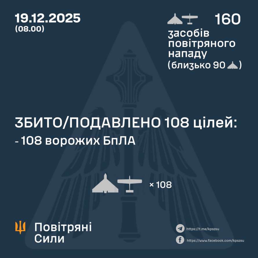 У ніч на 19 грудня (з 18.30 18 грудня) противник атакував 160-ма ударними БпЛА типу Shahed, Гербера і безпілотниками інших типів із напрямків: Орел, Курськ, Приморсько-Ахтарськ, Брянськ, Міллєрово– рф., Гвардійське - ТОТ АР Криму, близько 90 із них – "шахеди".