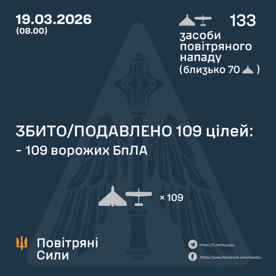 У ніч на 19 березня (з 18:00 18 березня) противник атакував 133 ударними БпЛА типу Shahed, Гербера, Італмас та безпілотниками інших типів із напрямків: Орел, Шаталово, Брянськ, Міллерово, Приморсько-Ахтарськ – рф, Гвардійське – ТОТ АР Крим, близько 70 із них – "шахеди".