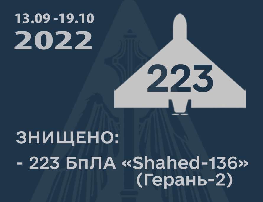 "Станом на 19 жовтня, із першого випадку збиття на території України дрона-камікадзе іранського виробництва Shahed-136 (13 вересня 2022 року, м. Куп’янськ), протиповітряною обороною Повітряних сил та інших складових Сил оборони України знищено 223 БПЛА цього типу", - повідомляє у Facebook командування Повітряних сил Збройних сил України.