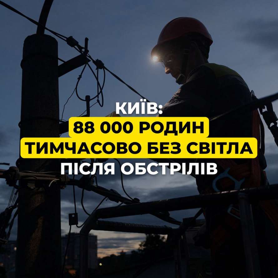 У ДТЕК повідомили, що у Києві через масовану атаку 88 000 родин тимчасово без світла.