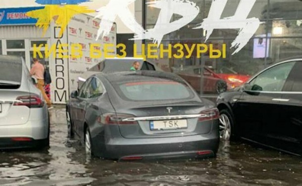 На Петрівці плавав авто Tesla, а на мосту Патона здуло огорожі. У цей час під Києвом дерево впало на дорогу, придавивши машину.