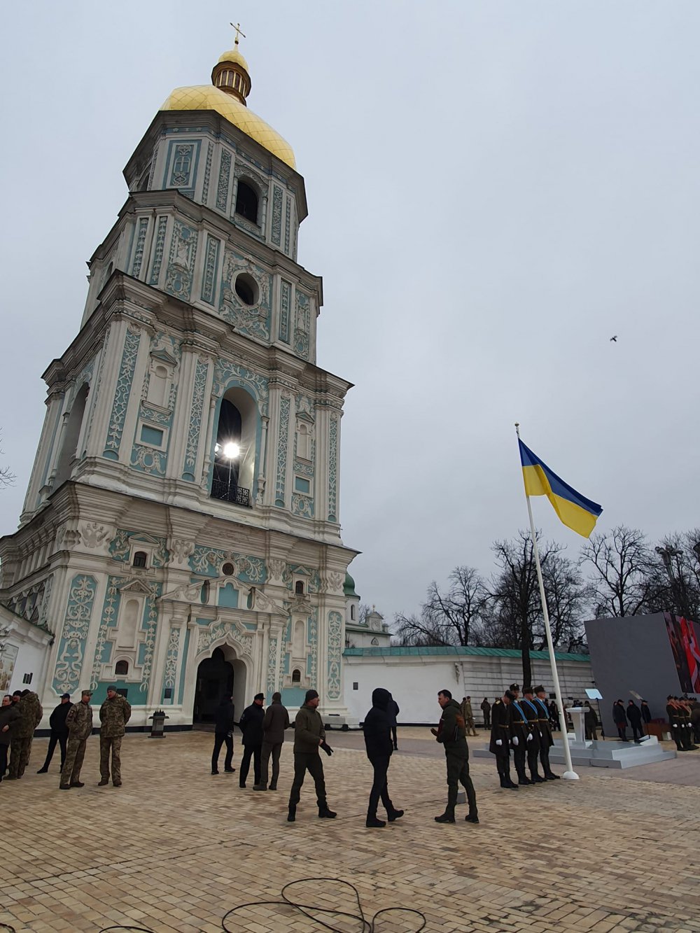 На Софійській площі зібралися, окрім Президента, Головнокомандувач ЗСУ Валерій Залужний та військові. Також на площі знаходиться міністр оборони Олексій Резніков, голова ГУР МОУ Кирило Буданов та інші.