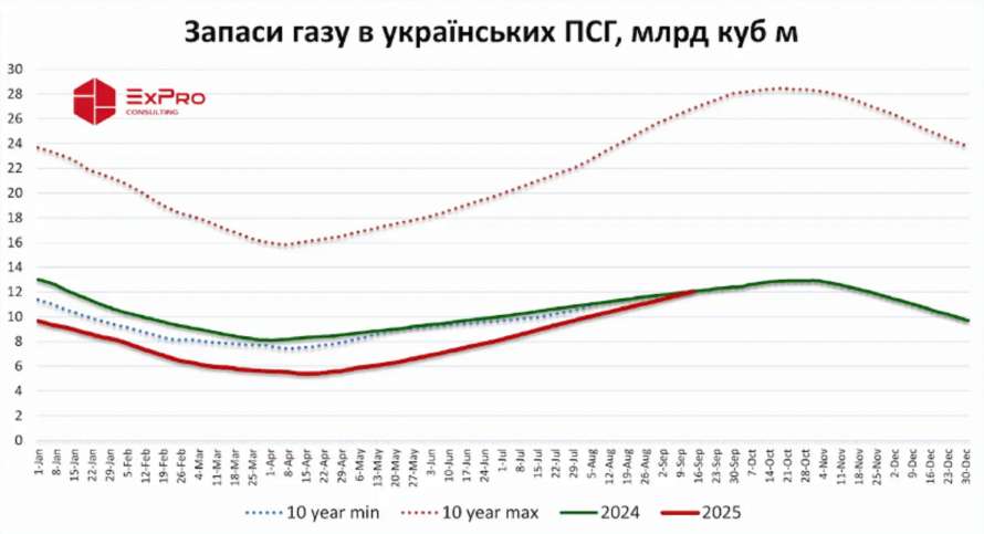 На 14 вересня 2025 року в українських ПСГ зберігалося 12,055 млрд. куб. м природного газу, в той час як 14 вересня 2024 року у сховищах було 12,05 млрд. куб. м, на 0,05% або майже 5 млн. куб. м менше газу.