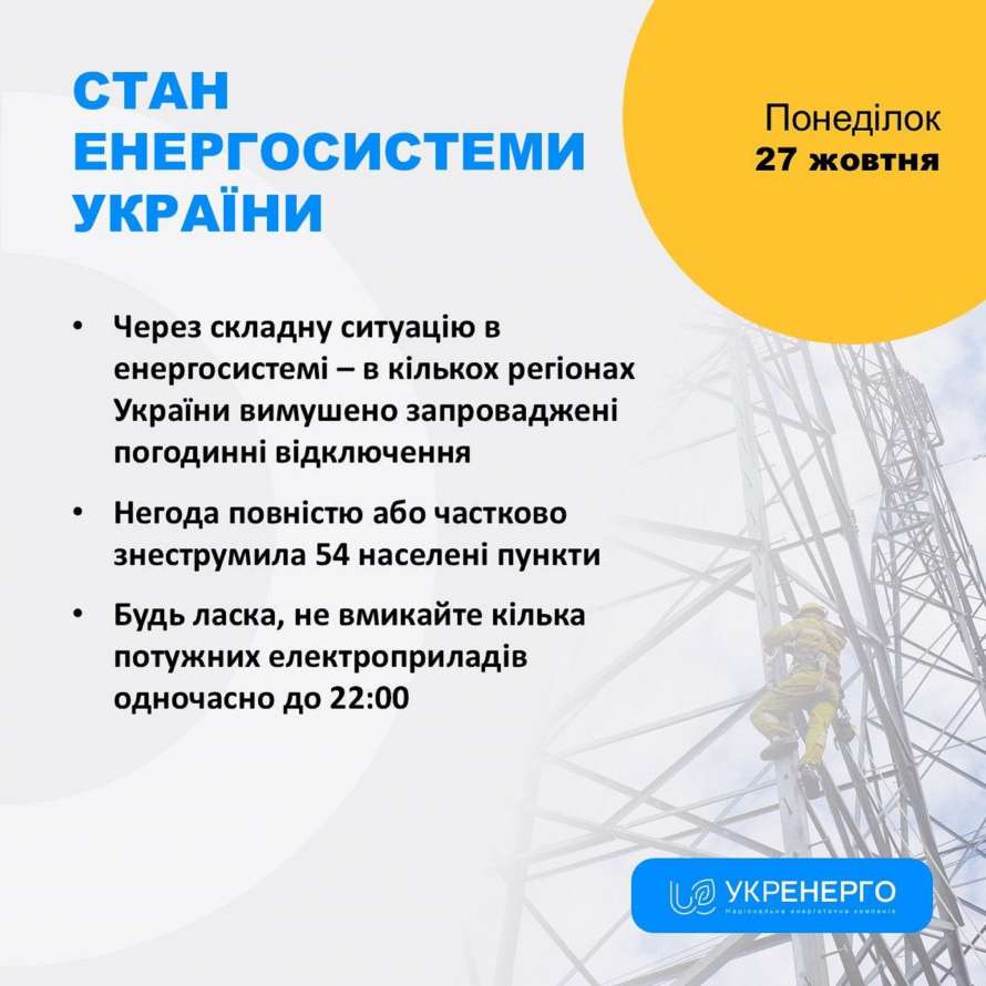 Станом на ранок 27 жовтня внаслідок російських ударів по енергетичних об’єктах є знеструмлені споживачі у Сумській, Запорізькій та Дніпропетровській областях.