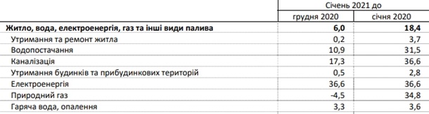Так, у січні тарифи на утримання і ремонт житла зросли на 0,2% (за рік - на 3,4%), на водопостачання - на 10,9% (31,5%), на каналізацію - на 17,3% (36,6%), на утримання житла і прибудинкових територій - на 0,5% (2,8%), на електроенергію - на 36,6% (36,6%), на опалення і гарячу воду - на 3,3% (3,6%).