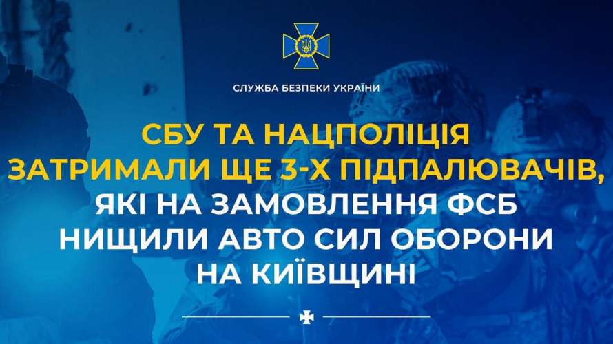 СБУ та Нацполіція затримали ще трьох поплічників країни-агресора, які вчиняли замовні підпали на Київщині.
