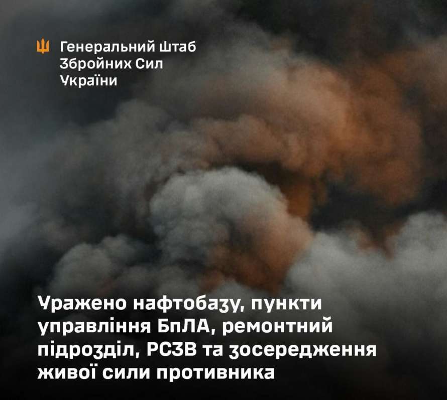 "За попередньою інформацією, уражено нафтобазу "Балашово" у Саратовській області рф. Результати уточнюються", - повідомляє Генштаб ЗСУ.